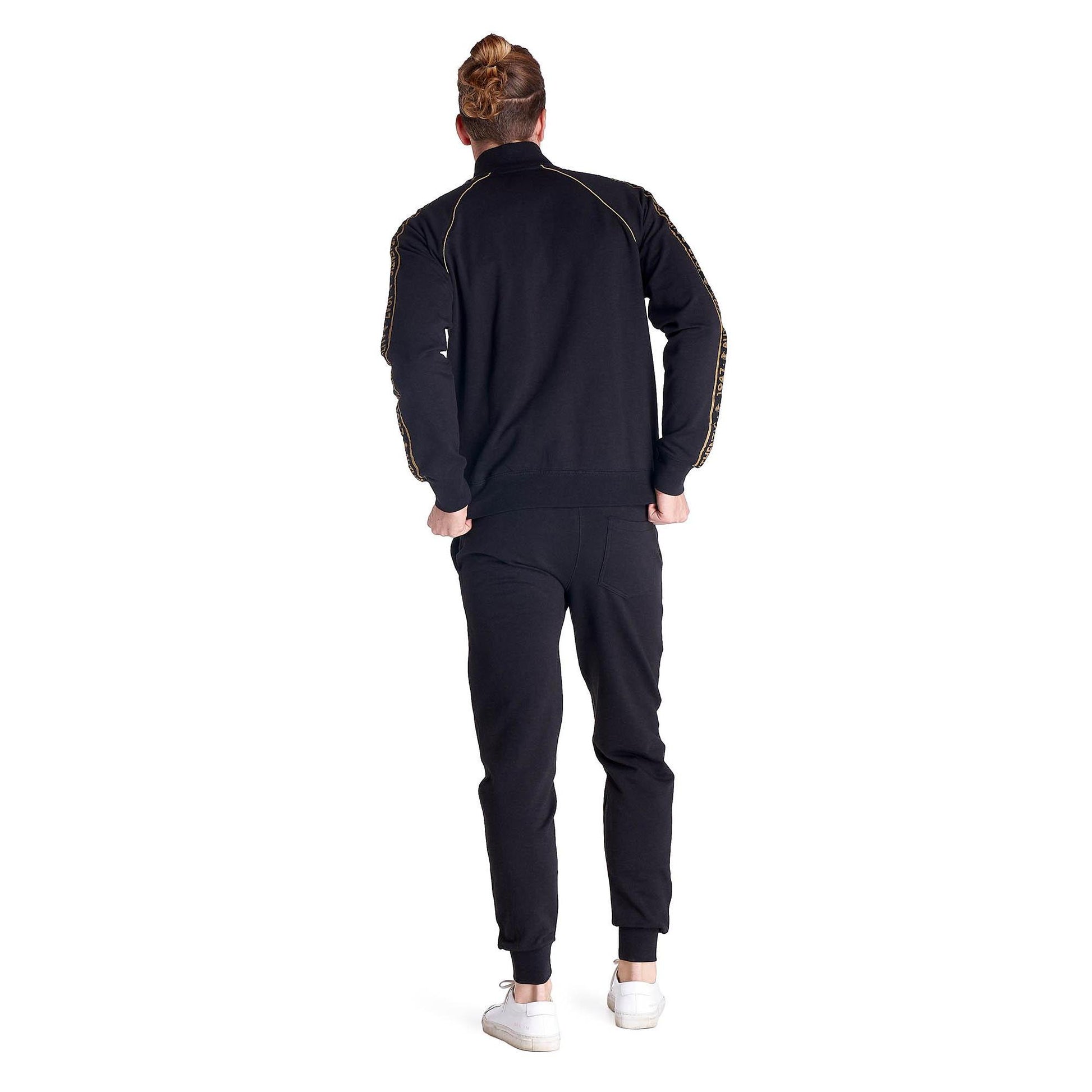 Tuta da uomo Leone 1947 Apparel, linea GOLD, in cotone elasticizzato. Dettagli felpa: logo color oro e tricolore altezza cuore Leone 1947. Sulle braccia, dal collo al polso, corre una barra color oro con stampa "Authentic 1947". Dettagli pantalone: a sinistra, sopra la tasca, il capo presenta una stampa in color oro dell'icona Leone 1947 e del tricolore italiano. Coulisse con inserti in metallo. Polsini in costina elasticizzata. Etichette tessute sono cucite all'interno del capo.